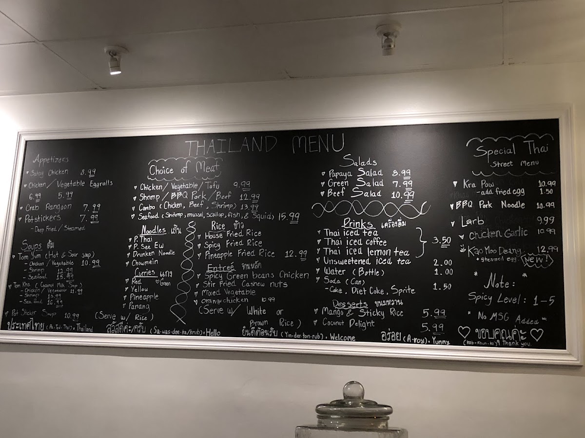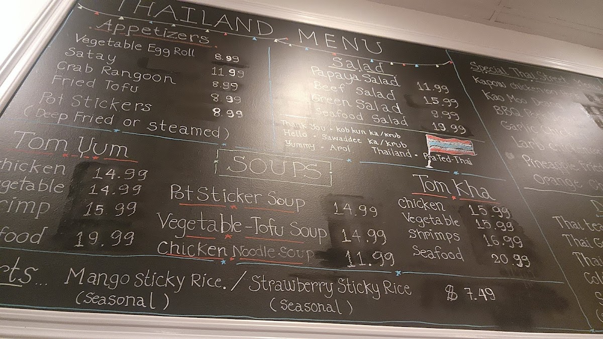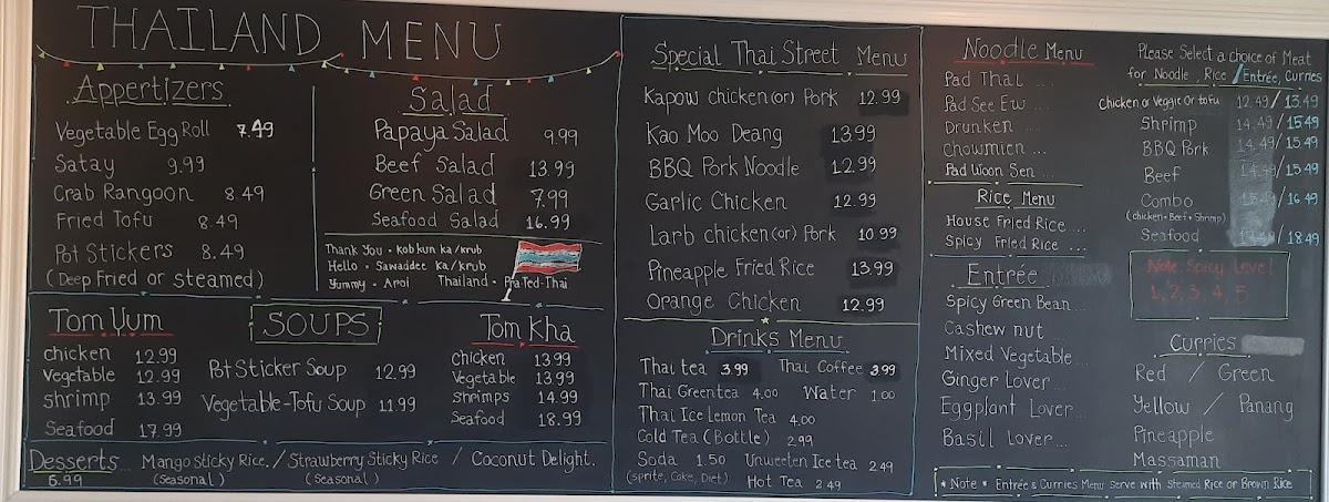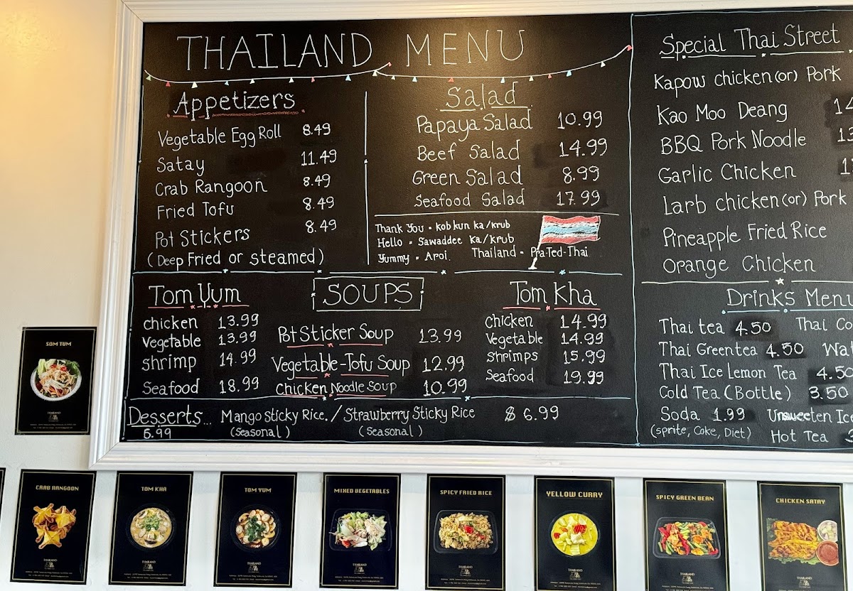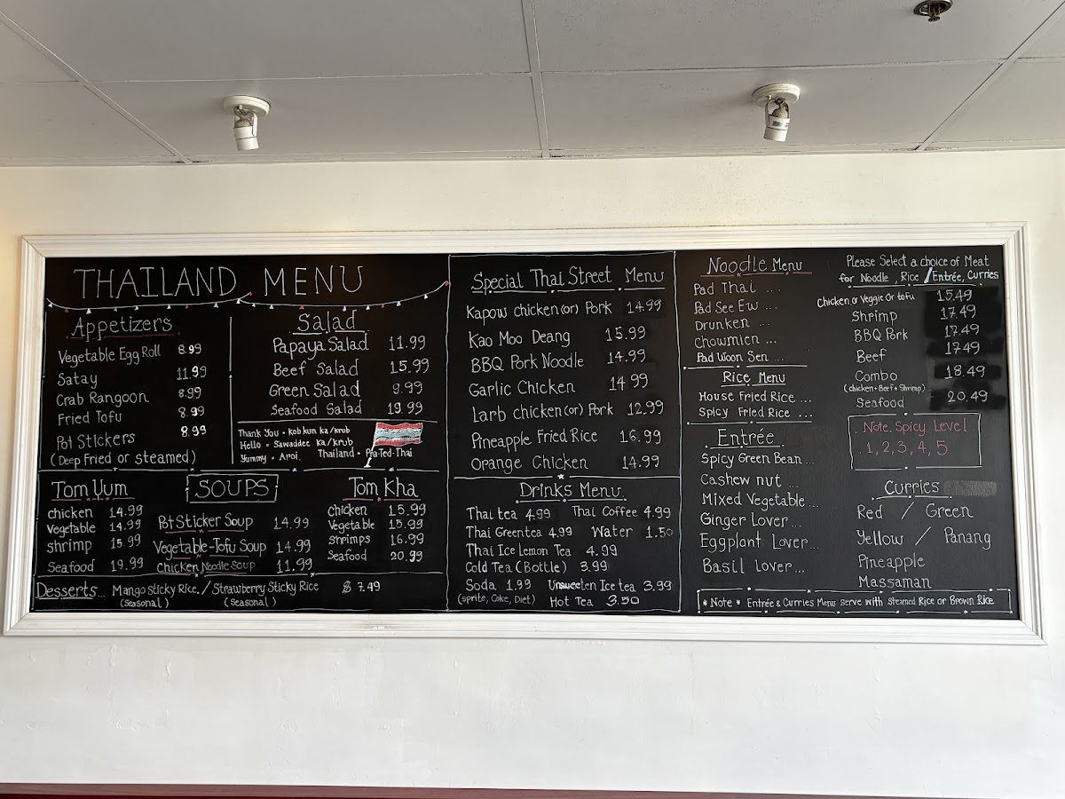 From a reviewer’s perspective, the menu at Thailand Togo (Thai Street Food) offers a well-rounded and satisfying selection that captures the essence of Thai cuisine at approachable prices. Starters like SATAY, VEGETABLE EGG ROLLS, and CRAB RANGOON set a flavorful tone, while comforting soups such as TOM YUM and TOM KHA provide classic hot-and-sour and coconut-based options with choices of chicken, tofu, shrimp, or seafood. The noodle section is a highlight, featuring staples like PAD THAI, PAD SEE EW, and PAD WOON SEN, with prices clearly structured from $12.49 for chicken/vegetable/tofu up to $17.49 for seafood. Similarly, the curry offerings-like RED OR GREEN CURRY, PANANG, and MASSAMAN-range from $13.49 to $18.49, delivering rich, aromatic flavors. Rice dishes such as HOUSE FRIED RICE and SPICY FRIED RICE follow a similar pricing tier ($12.49-$17.49), making them accessible and customizable. Entrées like SPICY GREEN BEANS CHICKEN and STIR FRIED CASHEW NUT continue the trend with prices from $13.49 to $18.49, offering hearty portions. The rotating street food specials, including KHAO MOO DEANG and KRA POW GARLIC CHICKEN, add variety and authenticity, while refreshing drinks like THAI ICED TEA (with optional boba for $0.50) and desserts such as MANGO STICKY RICE round out the experience. Overall, the menu strikes a great balance between variety, flavor, and value, making it a reliable choice for both casual diners and Thai food enthusiasts.
