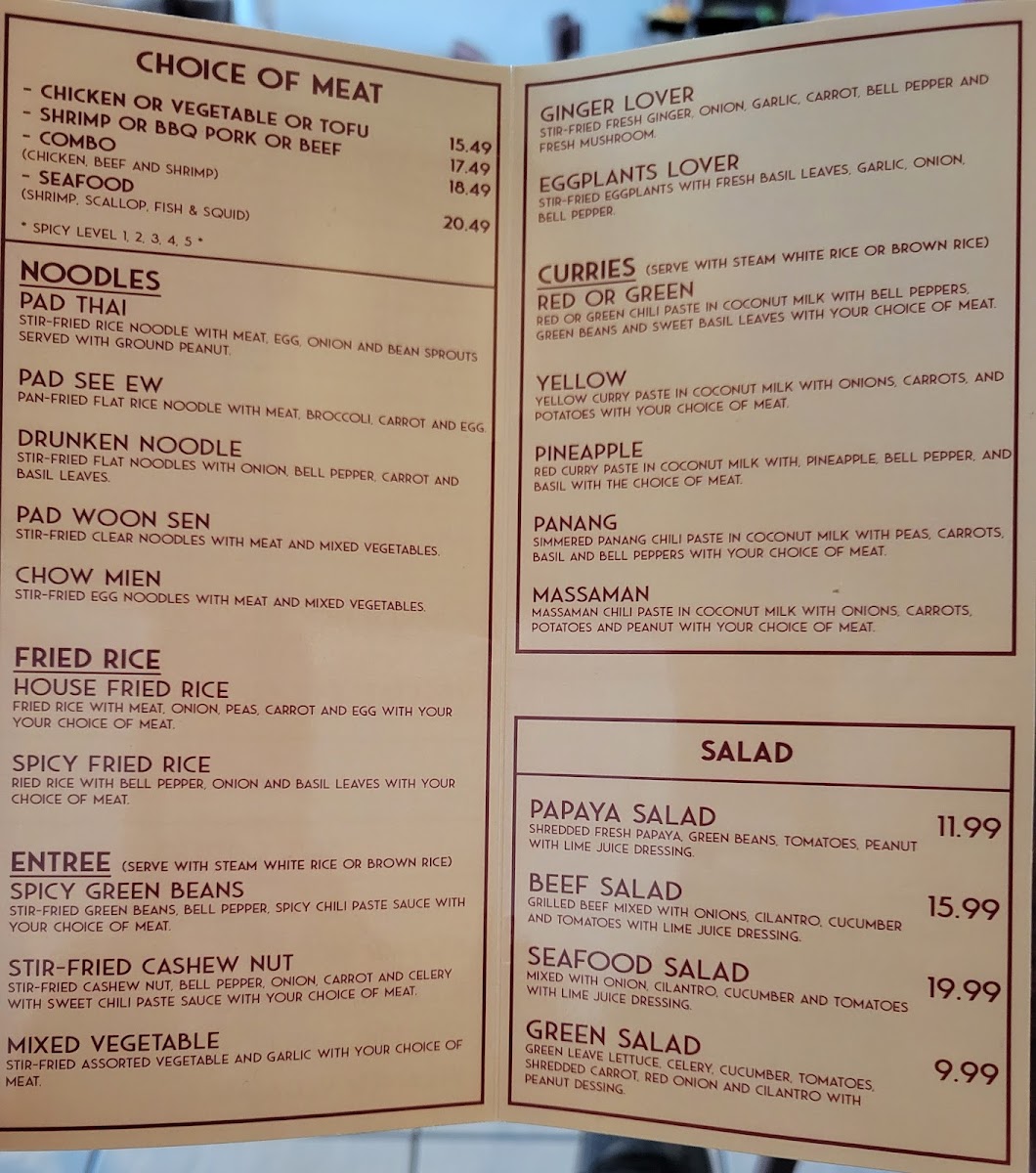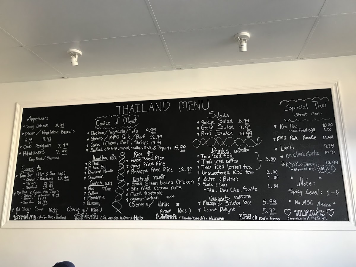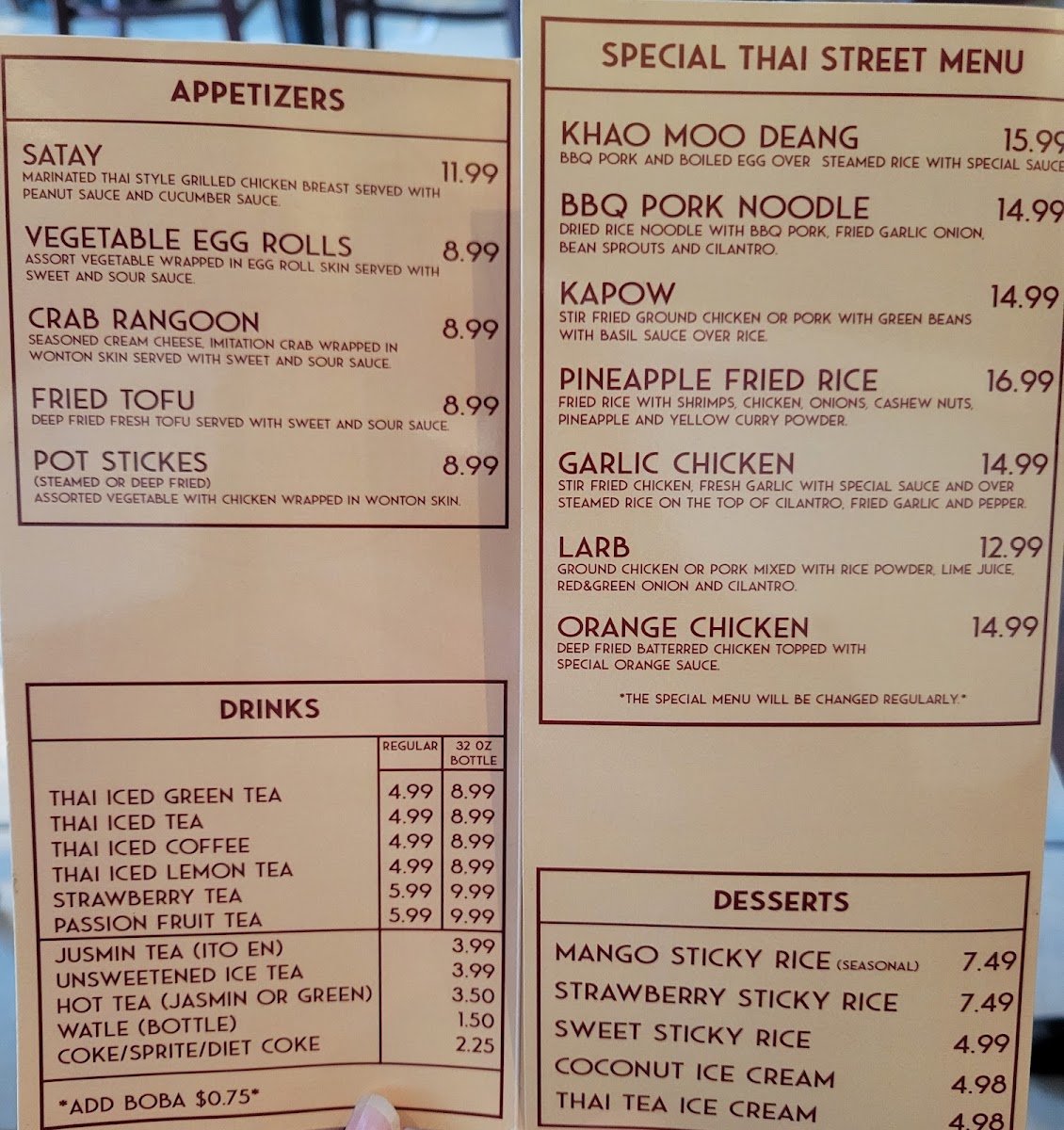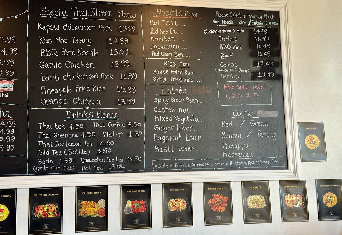 From a reviewer’s perspective, the menu at Thailand Togo (Thai Street Food) offers a well-rounded and satisfying selection that captures the essence of Thai cuisine at approachable prices. Starters like SATAY, VEGETABLE EGG ROLLS, and CRAB RANGOON set a flavorful tone, while comforting soups such as TOM YUM and TOM KHA provide classic hot-and-sour and coconut-based options with choices of chicken, tofu, shrimp, or seafood. The noodle section is a highlight, featuring staples like PAD THAI, PAD SEE EW, and PAD WOON SEN, with prices clearly structured from $12.49 for chicken/vegetable/tofu up to $17.49 for seafood. Similarly, the curry offerings-like RED OR GREEN CURRY, PANANG, and MASSAMAN-range from $13.49 to $18.49, delivering rich, aromatic flavors. Rice dishes such as HOUSE FRIED RICE and SPICY FRIED RICE follow a similar pricing tier ($12.49-$17.49), making them accessible and customizable. Entrées like SPICY GREEN BEANS CHICKEN and STIR FRIED CASHEW NUT continue the trend with prices from $13.49 to $18.49, offering hearty portions. The rotating street food specials, including KHAO MOO DEANG and KRA POW GARLIC CHICKEN, add variety and authenticity, while refreshing drinks like THAI ICED TEA (with optional boba for $0.50) and desserts such as MANGO STICKY RICE round out the experience. Overall, the menu strikes a great balance between variety, flavor, and value, making it a reliable choice for both casual diners and Thai food enthusiasts.